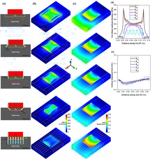 Figure 7b,d display the contour-fills of the residual stresses and the stress distributions at the deposit–substrate interface for different substrate settings. Note that the residual stresses are remarkably minimized by lowering the mechanical restraint of the substrate. For the sample, both the inner stresses and the stress concentration at the corner of the deposit are much lowered, almost without compromising the distortions, as shown in Figure 7c,e.