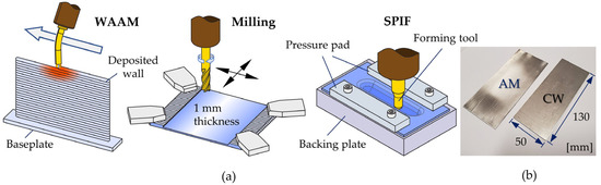 (a) Schematic representation of the hybrid manufacturing route to produce the AISI 316L stainless-steel sheets with stiffening grooves. (b) Photograph showing the additively manufactured and wrought commercial sheets before creating the stiffening grooves.