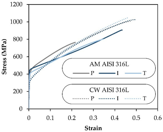 The flow curves of the additively deposited and wrought commercial AISI 316L stainless-steel sheets were determined by means of tensile tests on an INSTRON 5900 universal testing machine. The tests were carried out in accordance with the ASTM standard E8/E8 M-16 [16] and required cutting out specimens from the sheets at 0°(P-parallel), 45°(I-inclined) and 90°(T-transversal) inclination with respect to the build or rolling directions for each type of sheet. The results of these tests are shown in Figure 3, and Table 2 includes a summary of the mechanical properties for each testing direction.