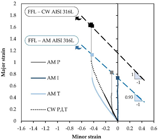 Fracture forming limits of the additively deposited and wrought commercial AISI 316L stainless-steel sheets in principal strain space (data obtained from [14]).