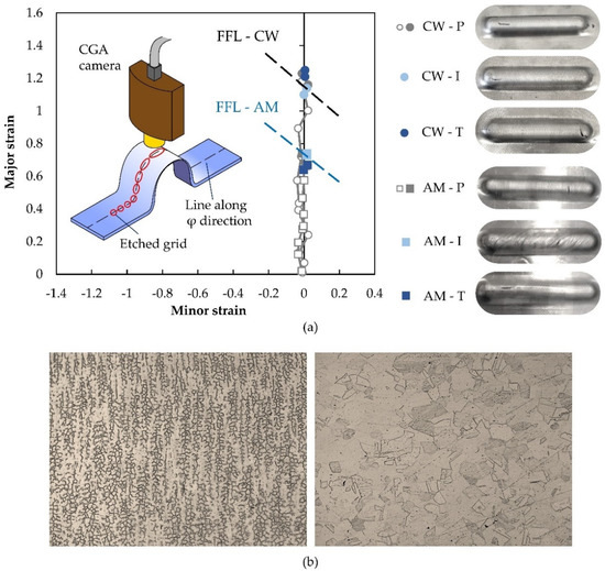 (a) Principal strain space showing the experimental strains that were measured by circle grid analysis in both additively deposited and wrought commercial sheets with photographs, showing details of the test specimens; (b) microstructures of metallographic samples taken from the (left) additively deposited and (right) wrought commercial AISI 316L stainless-steel sheets.