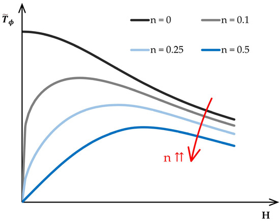 As seen, the evolution of the normalized force per unit of length is very much influenced by the strain-hardening exponent , with peak values moving towards the vertical axis as the stress–strain response approaches that of a perfectly rigid–plastic material. In fact, when , the peak in the normalized force per unit of length occurs at the beginning of the process () because there is no material strain hardening to compensate the reduction in thickness that is inherent to the incremental forming process, and the normalized force per unit of length falls monotonically from left to right as the thickness decreases with the groove depth .