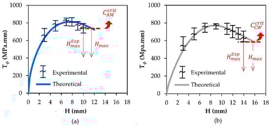 Evolution of the force per unit of length with the groove depth for the (a) additively deposited and (b) wrought commercial AISI 316L stainless-steel sheets. The dashed horizontal lines in both graphics correspond to the critical values and the intersections provide the maximum allowable predicted depths .