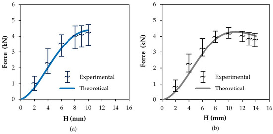 The maximum allowable predicted depths resulting from the above-mentioned intersections correspond to an overestimation of the maximum allowable experimental depths below 20%. The experimental points included in Figure 8 serve only to validate the theoretical evolutions of the force per unit of length with the groove depth.