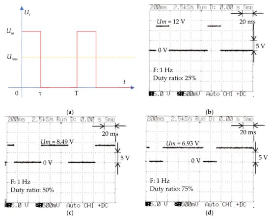 According to Equations (7)–(9), using pulse voltage with a root-mean-square voltage of 6 V, when the duty ratio is 25%, 50%, and 75%, the corresponding maximum voltage Um is 12 V, 8.49 V, and 6.93 V, respectively. The measured values of the rectangular wave voltage used for processing are shown in Figure 2b–d, respectively.