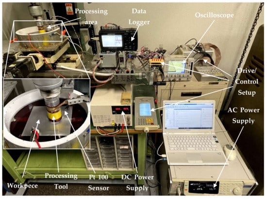In order to explore the processing characteristics of the P-EMAF process, the experimental setup was modified to enable P-EMAF processing. The P-EMAF External view of the experimental setup is shown in Figure 3. The processing area mainly contains the vertical milling machine, X-Y stage, compound processing tool, and Pt100 sensor. The start and stop of the spindle rotation and the stop of the X-Y stage are controlled by a single-chip microcomputer and its attached drive circuit. In addition, the output voltage of the DC power supply is controlled by the single-chip microcomputer and a Frequency–Voltage conversion module. The output waveform of the AC power supply is programmed by a computer, and the frequency and maximum voltage are achieved by setting the power supply. In addition, by programming the single-chip microcomputer, the processing requirements of different stages are met and the semi-automatic processing is realized.