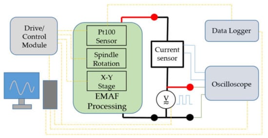 The schema of the EMAF setup is shown in Figure 4. As shown in the schematic diagram, the drive, and control device mainly integrate control modules such as a single-chip microcomputer, drive, relay, frequency to voltage conversion module, and programmer of X-Y stage, etc. The start and stop of the spindle, the stop of the X-Y stage, voltage output of DC-power supply, and ON/OFF of the AC-power supply are controlled during the processing by program. Because pulse voltage is used for P-EMAF processing, the high-frequency range that cannot be recorded by a data logger, the pulse voltage and current are displayed by a dual-channel oscilloscope. The temperature of the electrolyte during processing is monitored by a PT100 temperature sensor, and the temperature value is displayed by the indicator and recorded by the data logger. By compiling the program, the processing requirements of different stages can be controlled by a single-chip microcomputer.