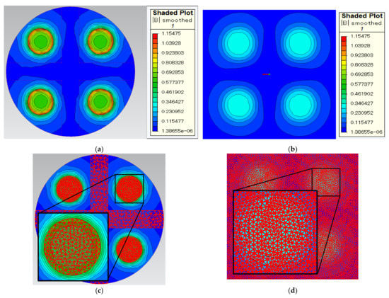Simulation of magnetic induction. (a) magnetic induction on the surface of processing tools; (b) magnetic induction on the surface of the workpiece (working gap 1 mm); (c) mesh of magnetic pole and electrode; (d) mesh of workpiece.