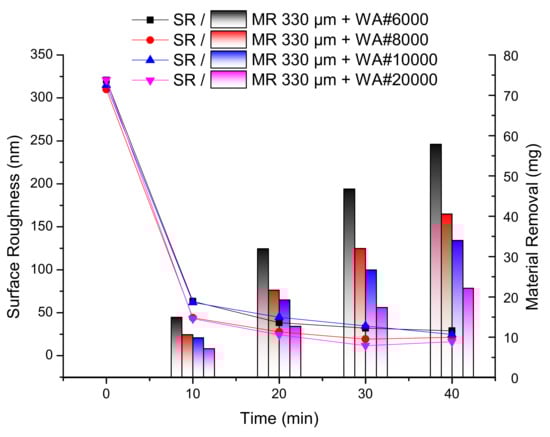 The results of the MAF experiment when using 330-micrometer electrolytic iron powder are shown in Figure 7. When the 330-micrometer electrolytic iron powder is used for MAF processing, all four types of abrasive have the largest change rate of surface roughness value in the first stage. From the second stage, the change rate of surface roughness value slows down. From the surface roughness value of each stage, the surface roughness value change law of WA#8000 and WA#20000 types of abrasive is relatively close. The WA#6000 and WA#10000 types of abrasive have a relatively close surface roughness value. However, the difference in average surface roughness values of the four abrasives after finishing is not large. Moreover, after 40 min of finishing, the final surface roughness values of the four types of abrasives are close to each other.