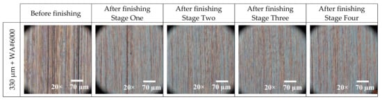 Figure 8 shows the surface morphology measured at position two before and after different stages of finishing. From the surface morphologies, the surface before finishing is relatively rough, and deep and shallow grooves exist. When the WA#6000 abrasive is used for MAF processing, only the finishing scratches and a deep groove remained after the first stage of MAF processing. After the second stage of finishing, there are only finishing scratches remaining on the surface. Because the particle size of the WA#6000 abrasive is relatively large, the processing traces are relatively rough. When the WA#8000 abrasive is used, after the second stage of finishing, only a few deep grooves remained on the surface, and the finishing scratches became smooth—smoother than when the WA#6000 abrasive is used. When the WA#10000 abrasive is used, as finishing progresses, the surface will become smoother; the deep grooves on the surface cannot completely be removed until the fourth stage of finishing, but they are not obvious. When the WA#20000 abrasive is used, the deep grooves remain on the surface and cannot be completely removed after the four-stage finishing, and the deep grooves are still obvious. Except for the remaining deep grooves, the surface becomes smooth, and the finishing traces are shallower than other types of abrasives. Based on the experimental results of surface roughness, material removal, and surface morphology, the type of WA#8000 abrasive is selected for the following P-EMAF processing.