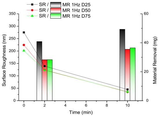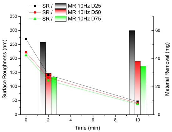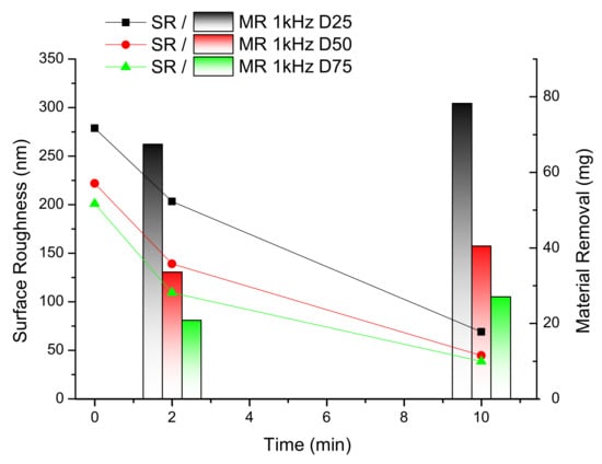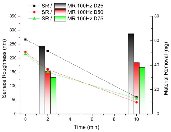 When the frequency is increased to 100 Hz, the experimental results of different duty ratios are shown in Figure 11. From the perspective of the change rate of the surface roughness value, compared with the frequency of 1 Hz and 10 Hz, after the two-minute P-EMAF processing, the decrease rate of average surface roughness value is obviously slower. After two min of P-EMAF processing, the material removal corresponding to the duty ratio of 25%, 50%, and 75% is 55.75 mg, 34.63 mg, and 29.82 mg, respectively.
