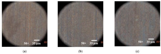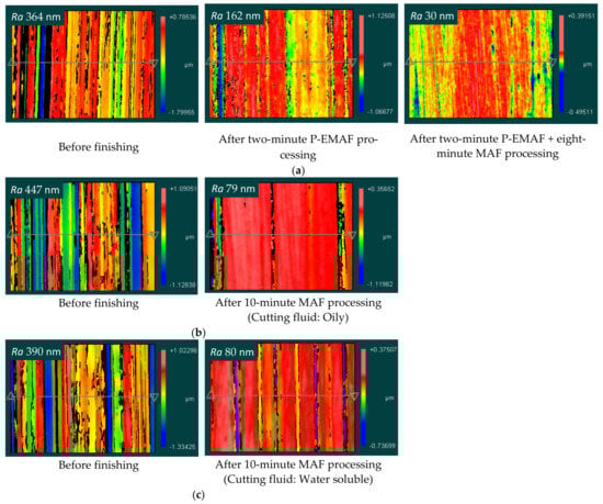 The 3D surface topography pictures are shown in Figure 16. When the frequency of the rectangular wave pulse voltage is 1 Hz, the duty ratio is 50%. It can be seen from Figure 16a that there are deep grooves on the surface before processing. After two-minute P-EMAF processing, the surface becomes flat, and after eight min MAF processing, the surface becomes smooth. After 10 min of MAF processing, there will be deeper grooves remaining on the surface, as shown in Figure 16b,c.