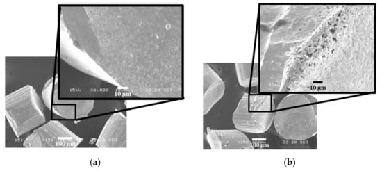 As shown in Figure 14, the iron powder before and after EMAF processing was observed by Scanning Electron Microscope (SEM). As shown in Figure 14a, the edges of the iron powder before processing are sharp; after processing, pitting appears on some of the iron powder particles and the edges where the corrosion occurs are rounded and small pits appear. This proves that during EMAF processing, the electrolytic reaction acts on the surface of the workpiece and the surface of the iron powder of the magnetic brush at the same time. Therefore, the shape of the magnetic brush will also affect the electrolytic reaction during EMAF processing. For example, as the processing progresses, the friction between the magnetic brush and the workpiece surface and the agitation of the electrolyte will cause the shape of the magnetic brush to change, resulting in a change in distance between the iron powder in the magnetic brush and the electrode. The change of the distance will cause the change of the impedance between magnetic brush and electrode, and the impedance determines whether the potential difference is sufficient for the electrolysis reaction to occur. If the amount of iron powder is too much, it will cause the iron powder to directly contact the electrode and cause a short circuit.
