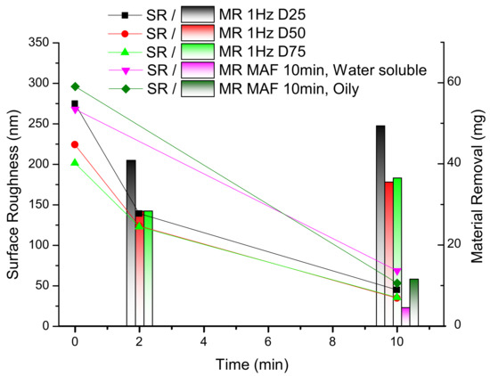 The experimental results are shown in Figure 10, when the 10 Hz rectangular wave pulse voltage with a duty ratio of 25%, 50%, and 75% is used. From the amount of material removal, it can be seen that after two min of P-EMAF processing, the highest material removal rate was obtained by using pulse voltage with duty ratio of 25%, and it is obviously higher than that of duty ratios of 50% and 75%. From the surface roughness, after eight-minute MAF processing, the difference of the average surface roughness values under the three conditions becomes smaller, and a relatively smooth surface is obtained. The final experimental results show that when the frequency is 10 Hz, the duty ratio is 25%, 50% and 75%, the corresponding surface roughness value and material removal amount is Ra 46.3 nm and 60.01 mg, Ra 41 nm and 38.18 mg, and Ra 37.3 nm and 34.72 mg, respectively.