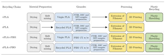 Four different recycling chains, Figure 1, composed by the material preparation, filament extrusion, fabrication of 3D samples, evaluation of properties, and plastic recycling, were employed in order to access the recyclability of PLA and the recovery of its properties via the addition of PBO. The first recycling process chain was based on the neat PLA and will be referred hereafter as vPLA. A second recycling chain based on recycled PLA obtained through a mechanical recycling simulation encompassed by the processes of drying, filament extrusion, and 3D printing was considered as a reference for the behavior of the recycled material and will be designated hereafter as rPLA. The remaining recycling process chains were obtained by the compatibilization of the neat and recycled polymer with PBO and will be referred as vPLA+PBO and rPLA+PBO. The CE content was fixed on 1% w/w based on the knowledge gathered from previous works involving the upgrading strategies for recycled PLA [].