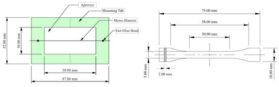 Representation of the mounting tab for single-filament tensile tests (According to []—left) and technical specifications for the ISO 527-02 Type 1BA dumbbell tensile test specimen (According to []—right).