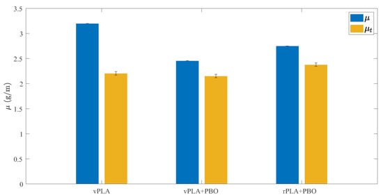 From the analysis of the linear mass density consistency (Figure 3), it was possible to identify the presence of inclusions, such as air bubbles or other contaminants, entrapped within the filament. In this context, vPLA presented a deviation between and of 31%. On the other hand, vPLA+PBO and rPLA+PBO, presented a deviation between and of 12% and 14%, respectively. These results demonstrate that the virgin PLA was the most dopped formulation. There was no evidence of what kind of inclusions were present in the virgin PLA formulation, and, therefore, they were assumed to be related to the presence of additives that were incorporated into the supplied PLA (e.g., antioxidants) during the melt-mixing stage, as it was the most exposed processing stage due to the lack of a protective atmosphere. Further processing stages were responsible to minimize the inclusions, possibly caused by the molecular chains reorganization, and, therefore, are assumed to be the reason for their absence in the recycled PLA formulations.