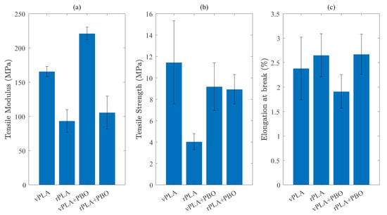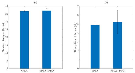 Due to printability constraints, it was not possible to produce enough replicates to address the mechanical performance of the recycled PLA-based formulations and, therefore, only the results for vPLA and vPLA+PBO are presented (Figure 11). Moreover, technological limitations regarding the testing equipment did not allow for the calculation of the tensile modulus for the given formulations.