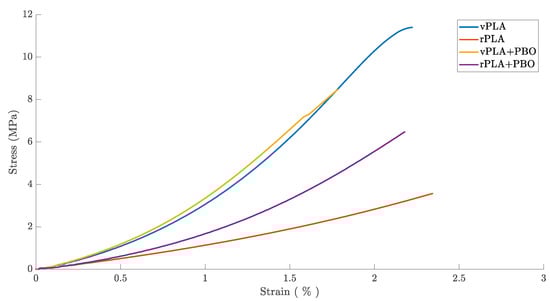 Stress–strain curves for virgin PLA (vPLA), recycled PLA (rPLA), virgin PLA mixed in the presence of PBO (vPLA+PBO), and recycled PLA mixed in the presence of PBO (rPLA+PBO), highlighting the recovery of the mechanical properties of rPLA after chain extension.