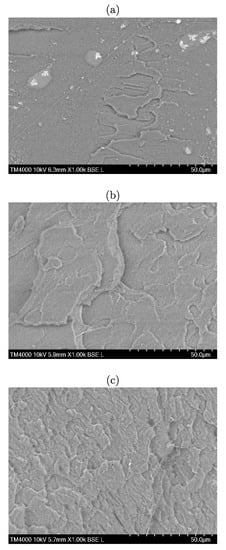 The smooth surface of the neat PLA (Figure 6a) suggests a brittle fracture of the material, corroborating with the literature [], which was, in fact, confirmed by the filament tensile tests. Moreover, the white areas highlighted on the micrographs may represent some kind of inclusions that were trapped into the polymer matrix during processing, a behavior also reported by Brüster et al when analyzing plasticized PLA-based formulations [] and which is in agreement with data from the linear mass density consistency analysis.
