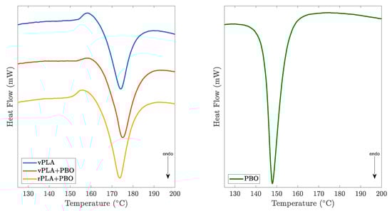 The thermograms of the PLA-based formulations (Figure 7; Table 4) showed the presence of a first endothermic peak between 155 °C and 159 °C related to the PLA crystallization. Further, a single melting peak appeared in the temperature range between 173 °C and 175 °C. On the other hand, the neat PBO thermogram showed the presence of an endothermic peak around 148 °C associated with its melting phase transition. From these results, an insignificant variation in the glass transition temperature between the virgin PLA and the compatibilized formulations was noticed, which is in agreement with several reports from the literature (see [,,]). Similarly, the cold crystallization temperature (T) did not significantly change, with exception of the rPLA+PBO formulation, which presented a slight decrease in T when compared to the virgin polymer counterpart. The determined melting temperature of vPLA was inferior to the one mentioned in the manufacturer’s TDS. This behavior may be explained by the material preparation stages, particularly the melt-mixing and grinding operations which were performed in order to normalize the degradation degreee between the virgin PLA and compatibilized formulations. However, among all the studied samples, the melting transition did not significantly change, which allowed for the material to be processed at constant conditions.