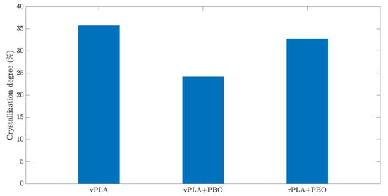 Representation of the crystallization degree for virgin PLA (vPLA), virgin PLA mixed in the presence of PBO (vPLA+PBO), and recycled PLA mixed in the presence of PBO (rPLA+PBO).