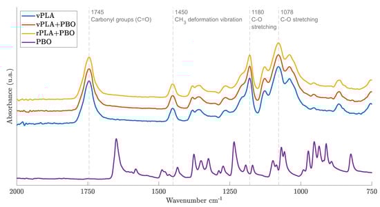 FTIR spectra for virgin PLA (vPLA),chain extender (PBO), virgin PLA mixed in the presence of PBO (vPLA+PBO), and recycled PLA mixed in the presence of PBO (rPLA+PBO).
