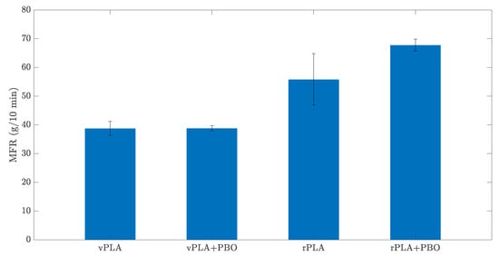 MFR of virgin PLA (vPLA), recycled PLA (rPLA) virgin PLA mixed in the presence of PBO (vPLA+PBO), and recycled PLA mixed in the presence of PBO (rPLA+PBO) at 180 °C and 1.2 kg load.