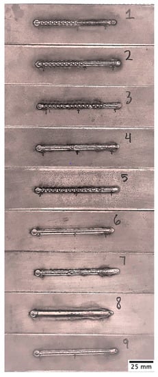 Deposited steel single-passes using the design of experiments parameters. The experiment numbers listed in Table 2 can also be seen in this figure.