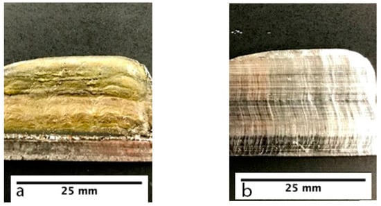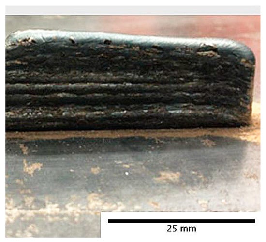 Another problem during deposition also appeared during the multi-layer deposition process. Although the endpoint keeps constant in building a single wall, the line length got shorter after each layer. Therefore, the very end edge of the built wall became tapered instead of being perpendicular to the base plate. The reason behind this problem comes from the deposition characteristic of the GTAW process. The molten metal is deposited behind the arc. Since there is no further movement at the end point, and newly deposited metal does not fill the area under the arc and makes the wall length shorter than the arc traveling length. To mitigate the tapering problem, the end point of each line was set to be 2 mm longer for each deposited layer. In addition, wire feed rate was increased by 10% at the last 5 mm of the travel path, which mitigated the problem to some extent but did not eliminate it. As the number of layers increased, this solution did not work properly. Figure 12 shows the results of a 30-layer wall structure deposited using Inconel 718 wire.