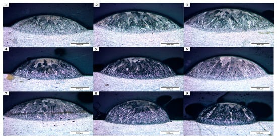 The transverse (perpendicular to the building direction) metallographic sections of the single-pass Inconel 718 samples. The processing parameters as well as characteristic measurements for the samples with corresponding parameter set numbers are presented in Table 5.