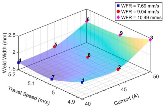 The relation between welding current, travel speed, welding feed rate (WFR), and weld width for Inconel 718 single-pass samples.