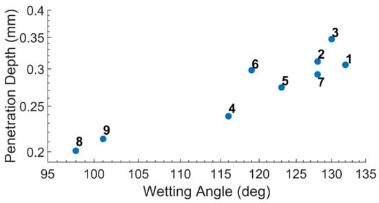 The relation between penetration depth vs. wetting angle for Inconel 718 single-pass samples. The number on the data points indicate the experiment numbers.