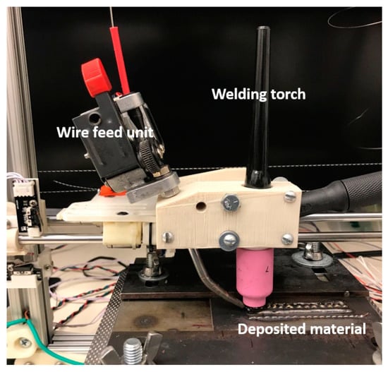 The material used for metal deposition was provided as a spool of wire, which was fed by an auto-feeder mechanism. The alloy was laid in front of the moving melting pool through an annular feed nozzle connected to a custom-made wire feeder. As seen in Figure 2, the auto-feeder mechanism was set to the left of the welding torch, and wire material was pushed from top to bottom in front of the moving melting pool. The material deposition direction was from right to left in the x-axis, as seen in Figure 2.