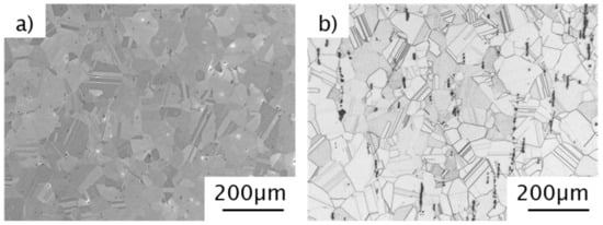 For the experiments, two different materials were investigated: Cr33.3Co33.3Ni33.3 MEA-system and Cr20Mn20Fe20Co20Ni20 HEA-system (both in at. %), both kindly synthesized by RU Bochum (Professor Laplanche). For that purpose, pure elements were used to produce inductively melted ingots in a high purity argon atmosphere. Subsequently, the ingots were homogenized at 1473 K for 48 h and rotationally swaged in seven steps to a cylinder with approximately 17 mm of diameter and a length of 100 mm. Final heat treatments (1 h at 1293 K for CoCrFeMnNi) and (1 h at 1333 K for CoCrNi) were performed to recrystallize the alloys and produce a similar grain size of approximately 50 µm for both alloys. The preparation of the single-phase FCC alloys [20,21] is described in more detail in [22,23,24]. The chemical composition of the ingots was determined by electron microprobe analysis (EMPA) in a JEOL JXA-8900-RL system and by spot measurements at 50 different locations per sample. The results are shown in Table 1. Hardness measurements (see also Table 1) were performed according to DIN EN ISO 6507-1 [25]; the reported values are the average of 12 measuring points. Light optical images of the single-phase FCC microstructures are given for both base materials in Figure 1. The specimens were embedded in epoxy-based, ground with 1200 grit paper and finally diamond-polished (grit size 1 µm). The etching was performed using Beraha-II etchant for 15 s at room temperature. There are dark particles in both alloys, which are CrMn-oxides (CoCrFeMnNi) [26] and Cr-oxides (CoCrNi) [9], respectively, which originate from the material production.