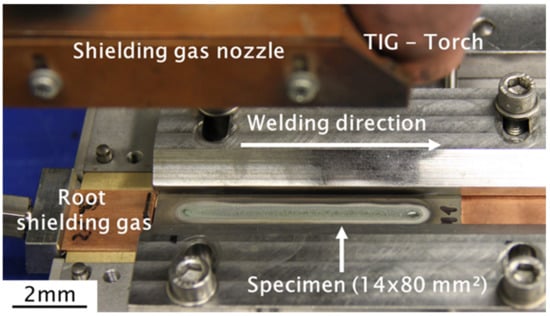 For the welding experiments, 1 mm thick plates with dimensions 14 × 82 mm2 were cut from the recrystallized ingots by electrical discharge machining (EDM) using an AP 450L from SODICK and a brass (Cu63Zn37) wire. Subsequently, two welding tests were performed for each alloy. One sample remained in “as-machined” EDM condition; the other was additionally ground (SiC 600 grit paper). The idea was to investigate the influence of the different surface preparation conditions on the weldability as surface contaminations perhaps alter the results (see Section 1). Prior to the welding tests, the surfaces were cleaned with ethanol to remove organic compound residuals such as grease. The TIG welding experiments were carried out using a specially designed and custom-made manufactured specimen clamping system for the small specimens. The complete test setup is shown in Figure 2. Here, in addition to the TIG torch, a gas trailing nozzle can be seen to cover the weld metal even after welding. The same applies to the root, which is to be protected from oxidation by means of shielding gas. For welding, a Polysoude PC 600 TIG system with the data given in Table 2 was used, ensuring a remelted bead-on-plate-like weld seam with approximately 70 mm length. The experimental parameters were determined using a single-phase FCC Ni-base alloy (2.4858), since these have comparable thermophysical properties and only little HEA and MEA material is available.