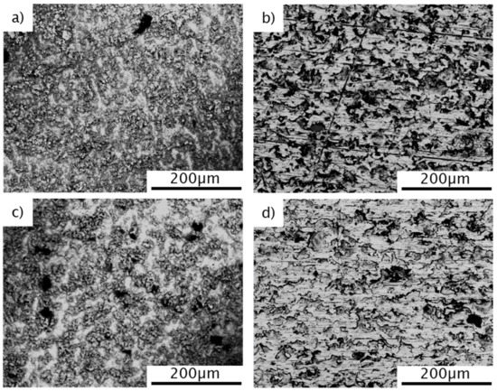 In order to determine the influence of the surface preparation on the welding process, the surfaces were characterized before. Figure 3 shows SEM images of the surfaces after EDM (parts a,c) and additional grinding (parts b,d) of the HEA and MEA. Both alloys show clear bright deposits on the surface after EDM (see Figure 3a,c). These were removed by further grinding and were not visible anymore but show grinding grooves without directional orientation (see Figure 3b,d). The corresponding chemical composition of the surface areas (corresponding Figure 3) was investigated by EDX-mapping and is shown in Table 3. It can be seen that, only in the case of the EDM-prepared surface, significant amounts of Cu and Zn deposits can be found on the surfaces. This is due to electrical and electrochemical dissolution of the brass wire used, as EDM also requires an additional purging electrolyte to (a) set the electric connection between wire and workpiece and (b) to remove the eroded particles from the surface [29]. The ground surfaces show a composition close to the target composition without any Cu or Zn containing deposits.