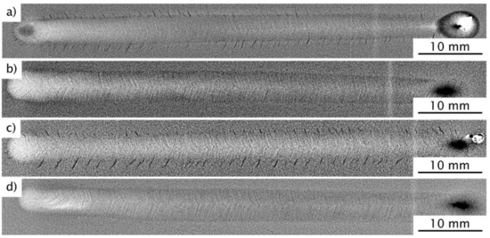 In order to verify the assumption of LME occurrence, µCT scans were performed on the weld of the CoCrFeMnNi HEA. For that reason, three different positions (virtual cross section positions) through the reconstructed volume are shown in Figure 8.