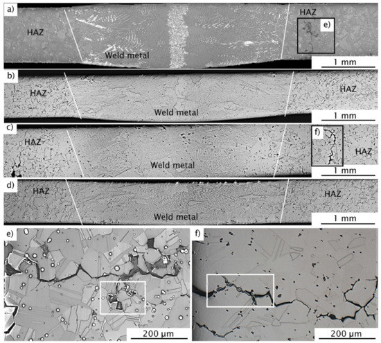Further details of the obtained cracks are presented with higher magnification in Figure 5e (HEA) and Figure 5f (MEA). Here, an intergranular characteristic of the cracks in the CoCrNi MEA and the CoCrFeMnNi HEA can be clearly seen. At the crack flanks of the CoCrFeMnNi HEA, brightness differences to the directly adjacent grain occur in some cases (counter-drawn in the white box in Figure 5e,f). In the case of CoCrNi MEA, changes also occur on the crack flanks compared to the surrounding material (marked in the white box). This difference on the crack flanks may indicate the presence of another phase. Otherwise, these effects can also occur due to inconsistent etching or edge effects. Intergranular cracks in the HAZ can be due to a large variety of crack mechanisms. On the one hand, it could be conventional hot cracking in the form of liquation cracks or ductility dip cracks (DDC) [30]. On the other hand, the cracks could also be initiated by a liquid metal embrittlement (LME) mechanism, which mainly occurs in, e.g., Zn-coated materials [31,32]. Cold cracking can be ruled out since both alloys have an increased elongation at fracture at temperatures below 400 °C [33] and, in addition, the CoCrFeMnNi alloy does not tend to strong hydrogen-induced embrittlement [34].