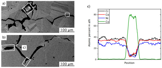 In this section, results of SEM and EDX investigations of the cracks and possible deposits on the crack flanks are presented. Figure 6a,b confirms the descripted effects from Section 3.3, as bright layers (in the white boxes) on the cracks of both alloys are clearly visible (image by BSD detector of SEM). The occurrence of another phase in this case would correlate with the conjectures described previously. Since the intensity of the backscattered electrons increases with the atomic weight, i.e., of the irradiated elements, in SEM investigations [35], these brighter areas in the images indicate a changed chemical composition on the crack flanks and grain boundaries, which, on average, contains elements of a higher order. Further examination was conducted by EDX line scans of the area marked in Figure 6b. The results are shown in Figure 6c. It is clearly visible that this region is enriched in copper compared to surrounding material. Since there is no copper in the base material, it must inevitably be molten copper from the EDM, which was liquefied at the elevated welding temperatures. It is assumed that the copper diffused or flowed into the crack as a liquid phase due to capillary forces, since the cracks are reaching from the fusion line to the specimen surfaces. However, the exact mechanism cannot be conclusively clarified due to a lack of knowledge and information in the area of research in connection with Cu diffusion in HEA or MEA materials. Therefore, these assumptions will be related to the cracking mechanisms and discussed further below.
