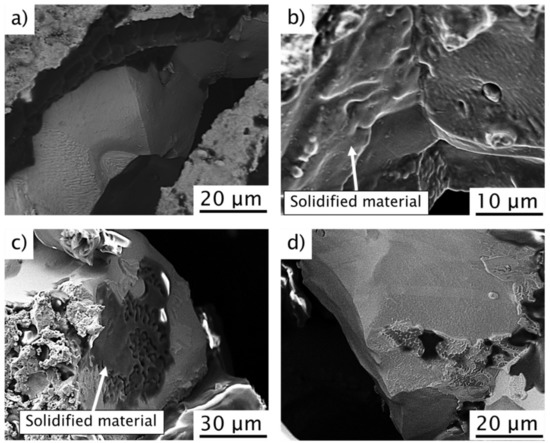 The examinations of the crack surface (Figure 7) show, as well as the cross sections in Figure 5 and Figure 6, an intergranular fracture surface. In addition, both materials show solidification morphologies on the individual grain boundaries in Figure 7b,c. In addition, the lighter copper deposits are clearly visible in the cracks of CoCrNi (Figure 7c,d), although this cannot be detected by EDX due to the position in the crack.