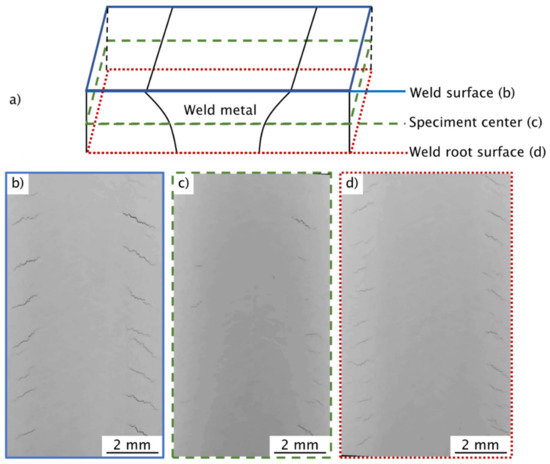 µCT-examination of weld and HAZ of TIG weld of CoCrFeMnNi HEA with EDM generated surface: (a) schematic view of sections in (b–d); (b) weld top surface; (c) specimen center; (d) weld root surface.