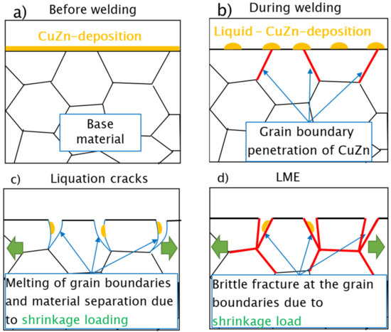 As shown in Figure 9c, for the mechanism of liquation cracks, this penetration may cause CuZn-rich phases to form at the grain boundaries, which become molten due to the elevated temperatures during welding. The grain boundaries then cannot endure the mechanical stresses from the welding-induced shrinkage of the clamped specimen, leading to material separation. It is assumable that this also acts as a crack initiation mechanism directly at the fusion line, and that further crack propagation is more likely to be due to the notch effect of the initial crack.