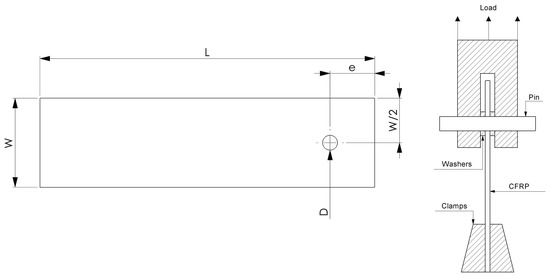 Schematic diagram of specimen and pin-load setup for the bearing strength test.
