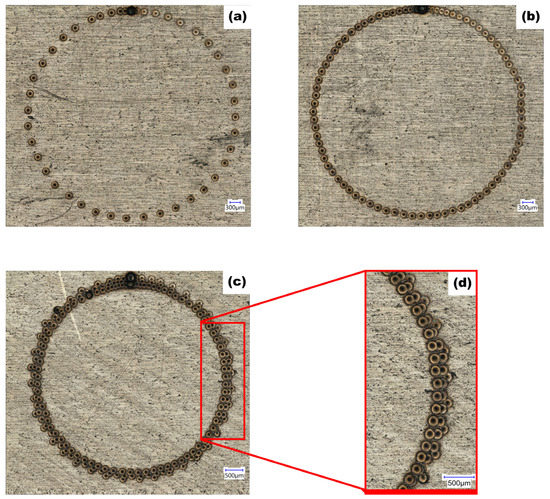 A stepped pulse frequency (i.e., repetition rate) method was chosen in the laser drilling of the CFRP sheet. Figure 5 shows a string of spots formed on stainless-steel surface for the stepped laser parameter multiple-ring drilling method.