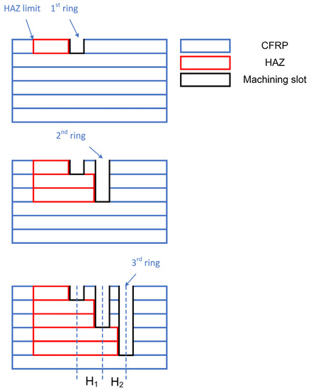 During the laser drilling process in the stepped laser parameter multiple-ring drilling method, 100 Hz of pulse frequency was chosen for the first ring. The irradiated area is shown in Figure 5a. A pulse frequency of 200 Hz was used for the second and third rings to increase the material removal rate. The surface morphology and pulse separation are shown in Figure 5b. The effect of pulse overlaps via this stepped parameter multiple-ring method is shown in Figure 5c,d. When the laser beam interacts with a material, an area of HAZ will be induced around each laser interaction spot via heat conduction. If there is an air gap between each ring, the extension of HAZ will be stopped. As a result, the first ring (100 Hz) would act as a barrier to prevent further heat conduction into the outer material and the carbon fibre was cut, and resin was removed. As shown in Figure 6, the heat conduction to the outer material by the second and third rings would be blocked by the first ring. Ideally, the resultant HAZ left on workpiece is close to the one induced by first ring only. More importantly, the HAZ size was mainly determined by the effect of the first ring and the heat damage induced by inner rings could not propagate into the outer material beyond the first ring. As a result, the stepped laser parameter multiple-ring drilling method allowed for a higher material removal rate in the inner material than that of the parent material, due to the increased laser energy input in the second and third rings, as shown in Figure 7a. This would allow more energy to be used for the material removal, rather than being wasted by conduction through the carbon fibres to the outer material beyond the first ring. This is compared with parallel ring drilling pulse overlaps using constant laser processing parameters as shown in Figure 7b.