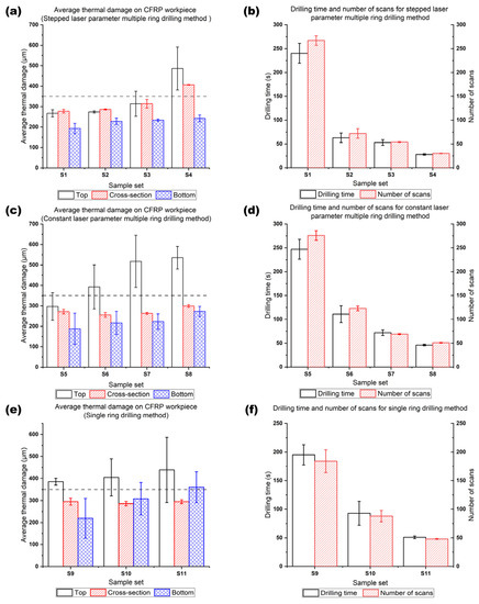 Comparing S6–S8 and S9–S11, even the constant laser parameter multiple-ring drilling method showed much better drilling efficiency than the single-ring drilling method without further increasing thermal damage.