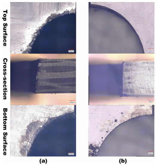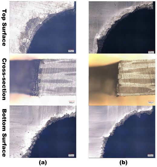 The mechanical drill bit was engaged reversely from the laser drilling hole exit side. No supporting material or special designed drill bit were used in the dry drilling of the CFRP workpiece. After the laser drilling, the average HAZ left on bottom surface was 161.70 μm (±1.79) and 316.25 μm (±67.99) on top surface. Figure 16 shows the comparison of the hole quality between the laser drilled pilot hole and mechanical finished hole. On the cross-sectional view, the HAZ and taper angle were removed by the mechanical finishing process. More importantly, no delamination was detected at the hole exit. This result was achieved with the assistance of mechanical finishing with reversed feed drilling strategy. No supporting material and special designed drill bit were used in this dry mechanical finishing process. With the assistance of this novel drilling strategy, a good balance between drilling quality and drilling cost was able to be achieved.