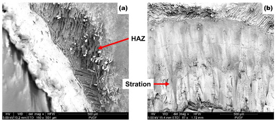 Figure 10 shows optical images of a CFRP workpieces after laser drilling with the two different parallel ring drilling methods. From the cross-sectional view, the HAZ was increased more rapidly along the fibre direction. However, by using the stepped laser parameter multiple-ring drilling method, more HAZ was detected in the direction that was perpendicular to the fibre direction. This is because in the stepped laser parameter multiple-ring drilling method, the laser energy input was not constant. The second and third rings produced more HAZ than the first ring. Therefore, the increased laser energy input also affected the area that was perpendicular to the fibre direction. Both top and bottom surfaces showed similar result, regardless of the difference in the HAZ. Resin spatter was formed on the top surface, which was due to the re-solidification of ejected resin from the machining area. More importantly, no delamination was detected on the cross section of CFRP workpiece which was the main benefit of the multiple-ring laser drilling. Figure 11 shows drilled CFRP morphology (with stepped laser parameter multiple-ring drilling method) examined using scanning electron microscopy (SEM). On the hole edge, there was an obvious de-bounded fibre which was due to the absence of resin. The cross-section formed a recast layer, and no obvious fibres were extruding out of the matrix. However, striation lines were present near the hole exit, which was due to the formation of a cyclic erosion front. The frequency of striation formation was more relevant to the transverse speed and laser power [6].