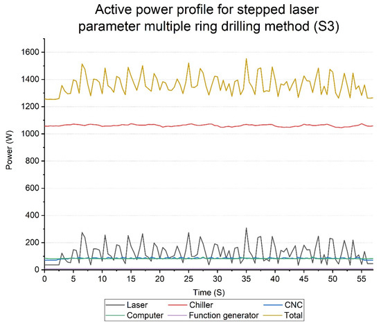Illustration of Total active power profile and sub-device power profile for Stepped laser parameter multiple-ring drilling method.